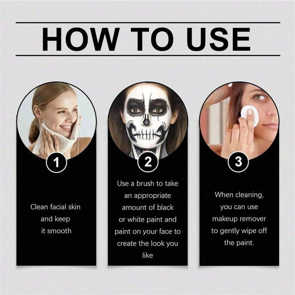 Unleash your creativity with this black and white face and body painting set, perfect for Halloween, theatrical performances, cosplay, role-playing, clown makeup, or special effects. With a large capacity, this set provides plenty of paint for full-face and body designs, allowing adults to create bold, dramatic looks with ease.